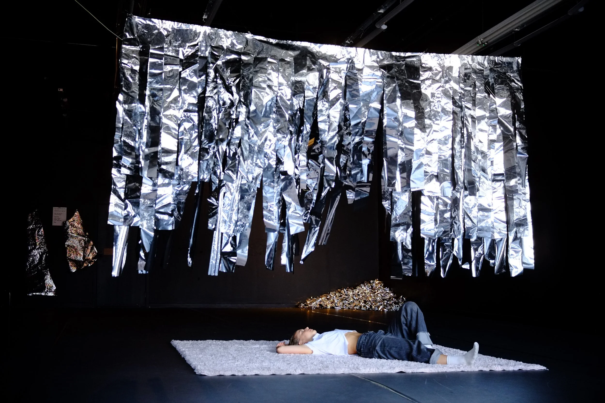 brilliant you is an interactive installation, made up of written scores and participatory prompts with corresponding objects, materials and environments that examine individual and collective presence through the reflection, reconstruction, and manipulation of mylar-paper. The installation is experienced through ‘open-hours’ which are dedicated to the public's independent activation of the installation. During this time, the public is invited to imprint, be with and arrange themselves in different ways amongst and within the highly-reflective mirror-like paper.